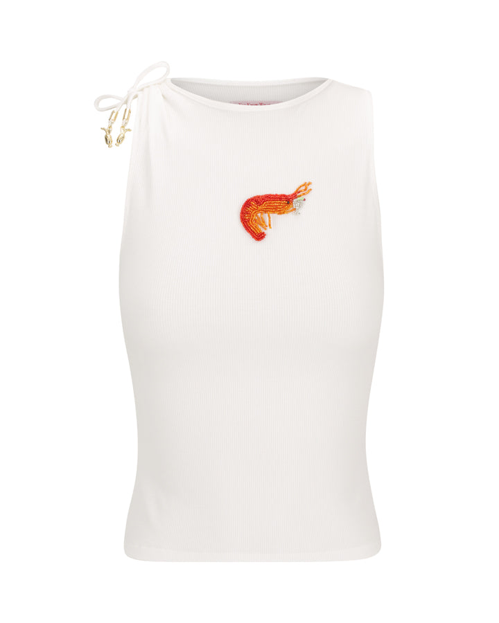 The Alysa Tank a true showstopper. Crafted from a soft, stretchy rib knit, this high neck tank is elevated with intricate hand beaded detailing: a playful prawn holding a martini glass at the centre. The drawstring shoulder straps are finished with custom gold vase charms, adding a luxe touch that’s uniquely yours. Bold, flirty, and unapologetically one of a kind this is the piece everyone will ask about.
