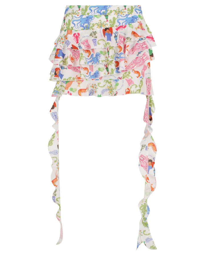 The Katrina Mini Skirt Feminine with a touch of drama. Crafted in a custom Aegean Dreams printed fabric and fully lined for comfort, this mini features cascading frills down each side, creating a fluid mermaid inspired silhouette. Finished with a side seam zipper and hook and eye closure, it’s playful, flattering, and designed to make every entrance unforgettable.